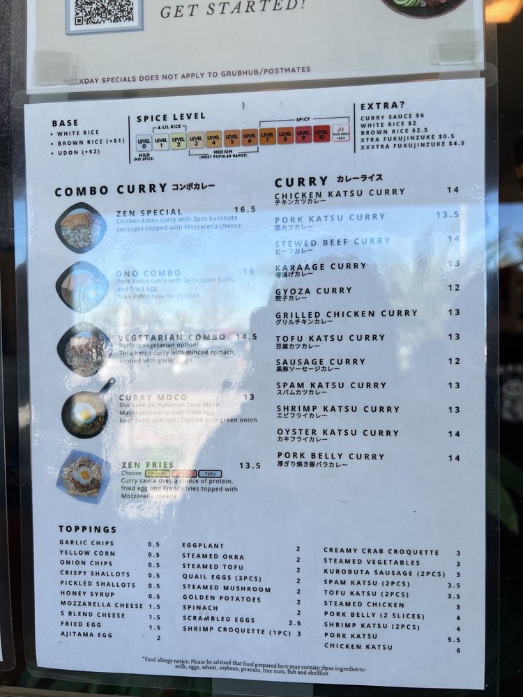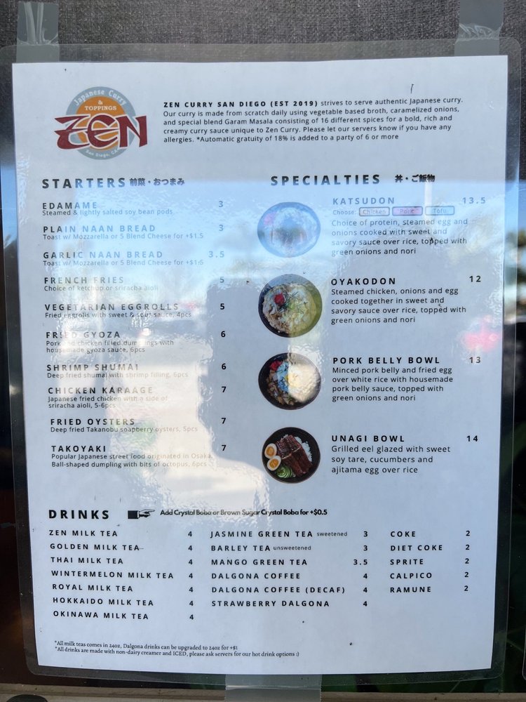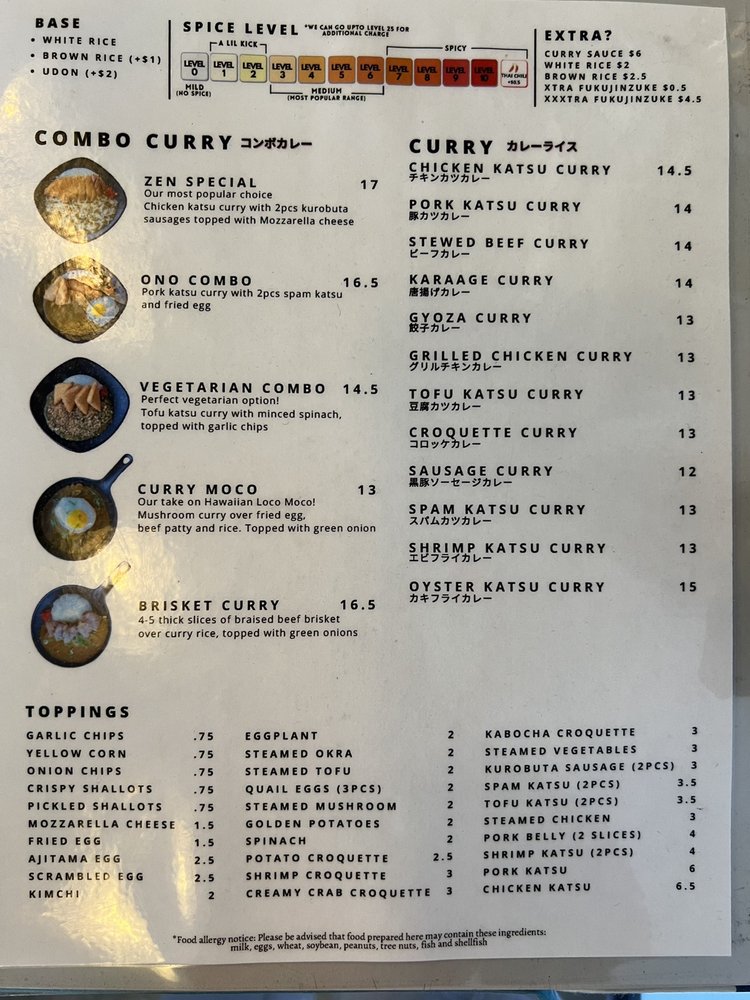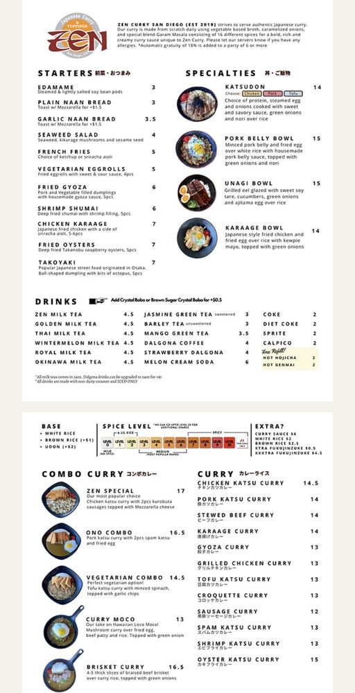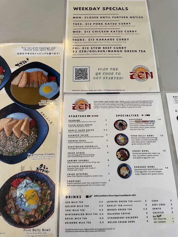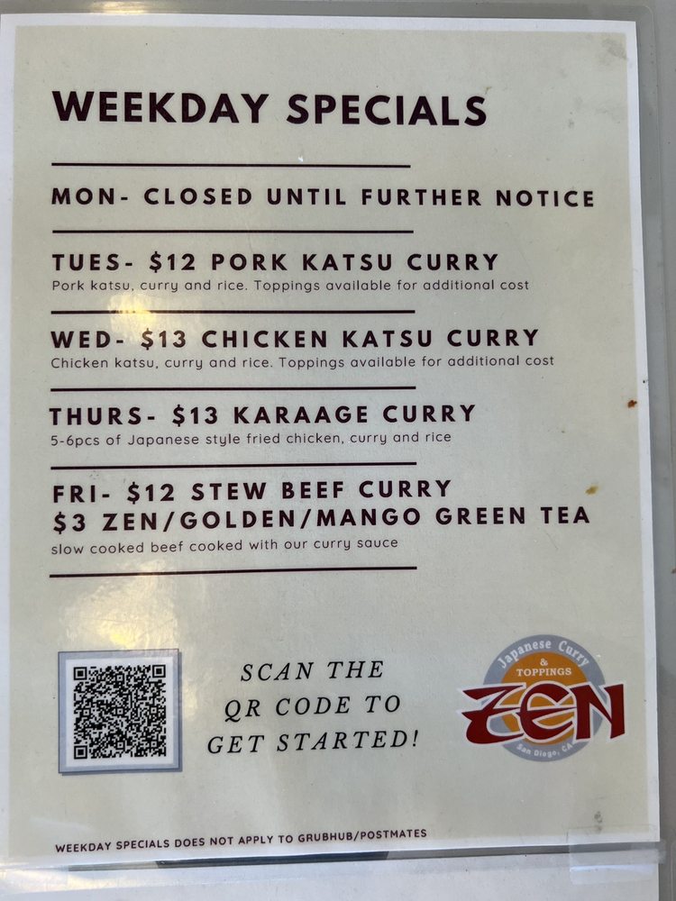 Zen Curry - Temp. CLOSED is a Japanese curry spot in San Diego that offers a cozy and authentic dining experience. The menu boasts a variety of options, including fried oysters, katsu dishes, and flavorful curry. Customers praise the juicy chicken katsu, rich curry flavors, and customizable spice levels. The restaurant is known for its quick service, friendly staff, and ample parking. Whether you're looking for a casual lunch or a group dinner, Zen Curry has you covered. Don't miss out on their delicious offerings before they close indefinitely. Be sure to check their current hours on Yelp for the latest updates.